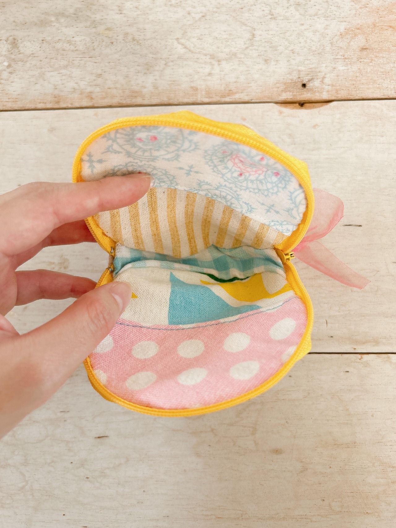 内側は刺繍で使われている色の生地を中心にパッチワークしました