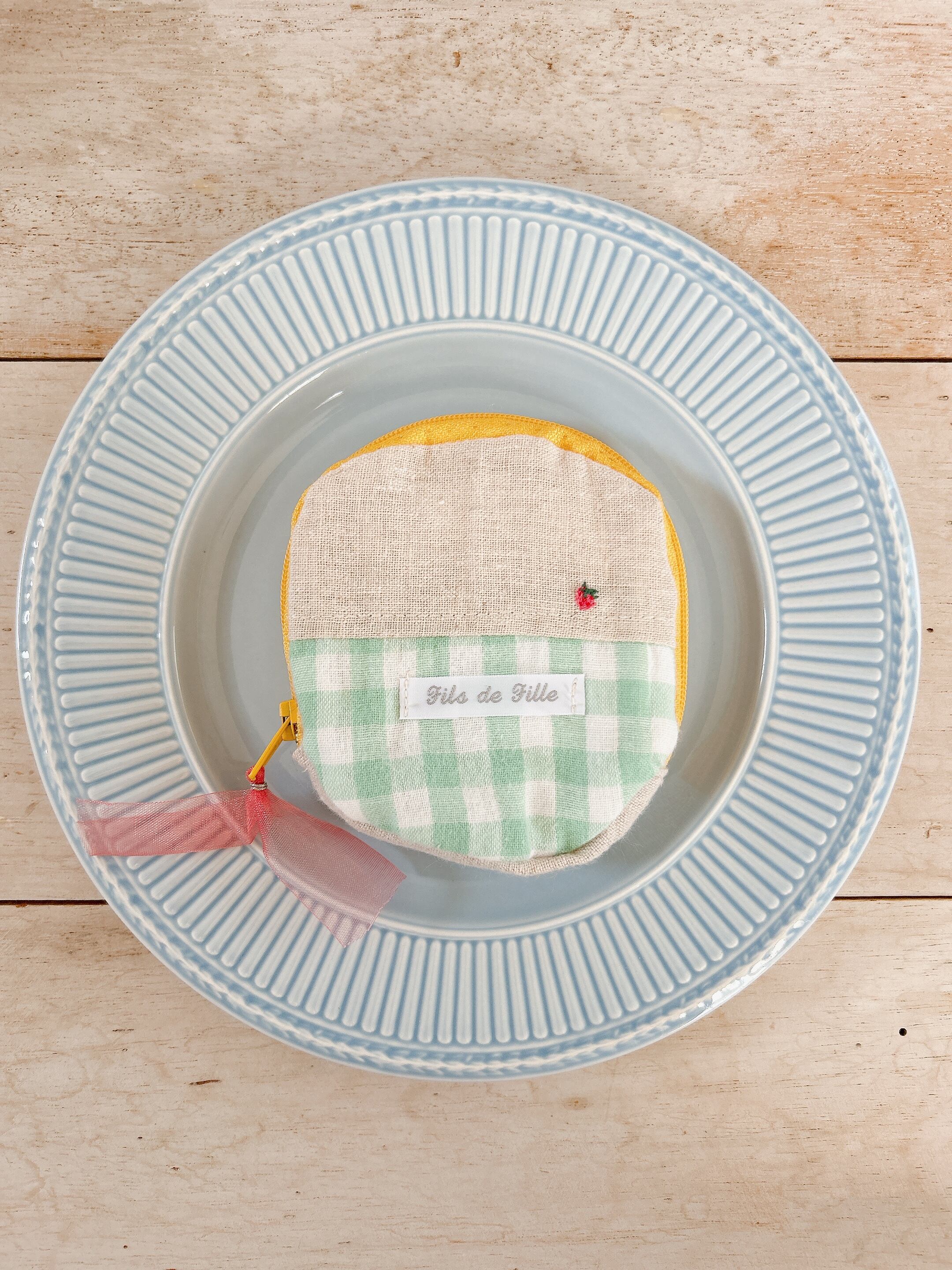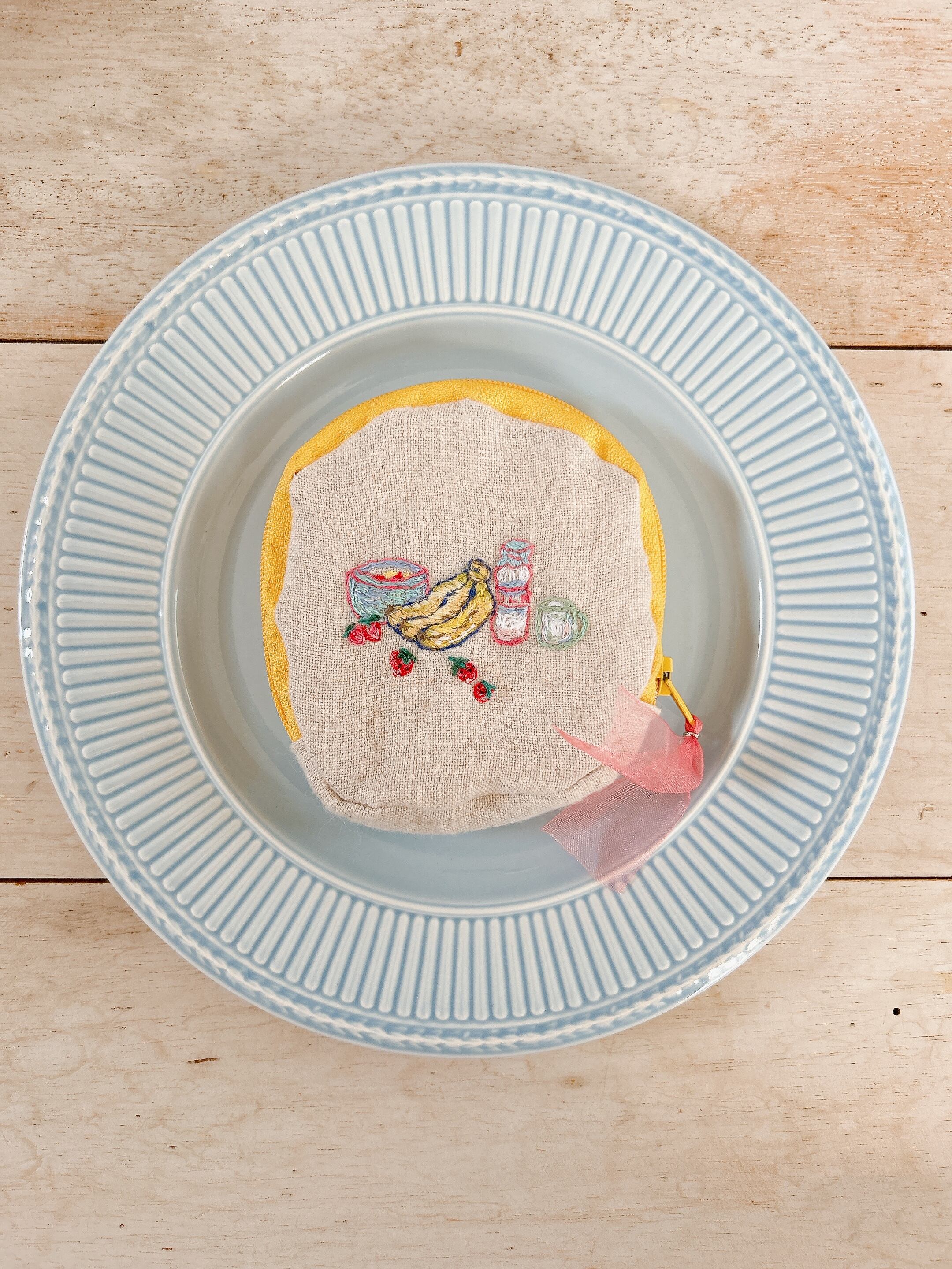 刺繍が施された手のひらサイズのポーチ