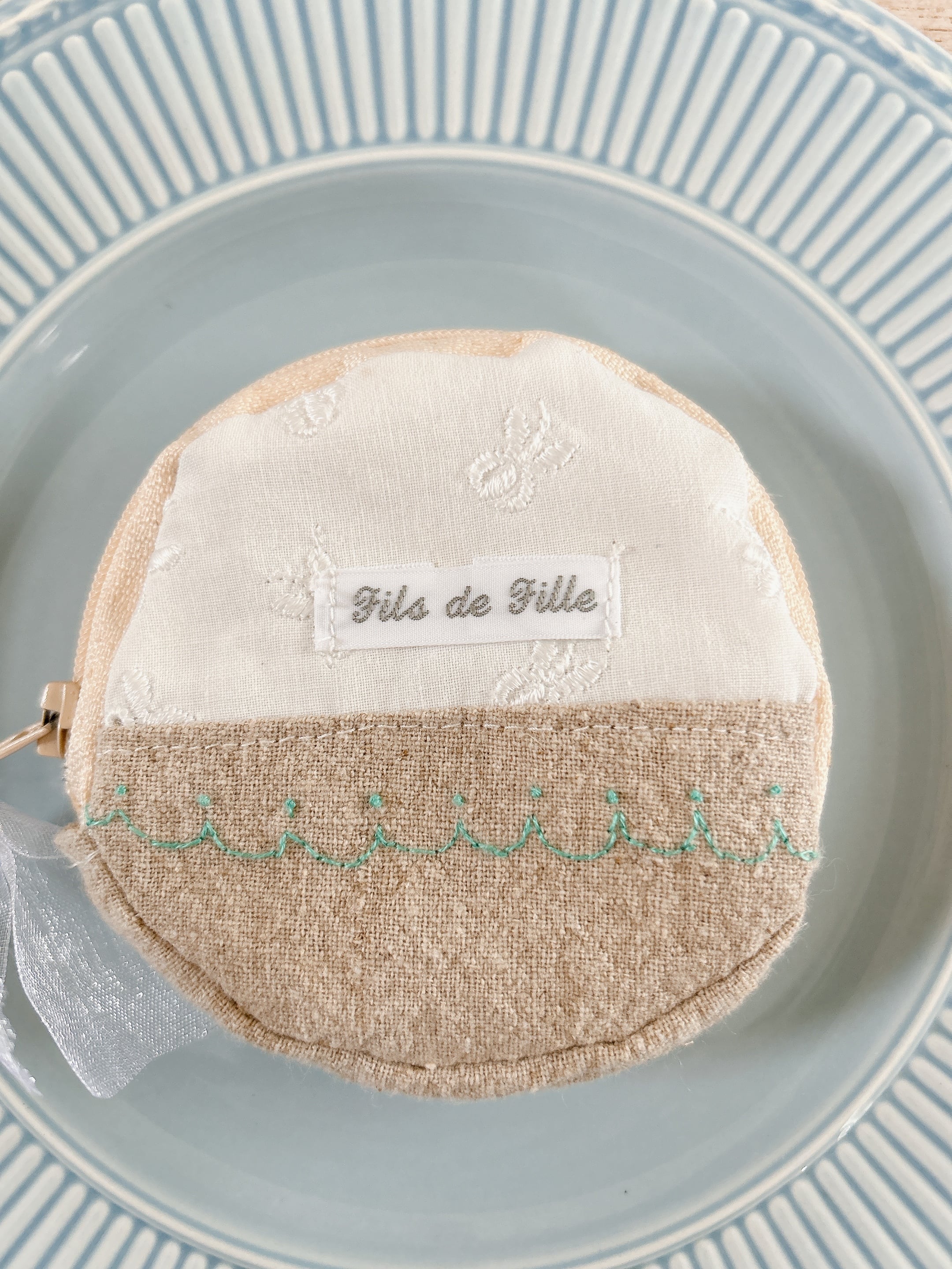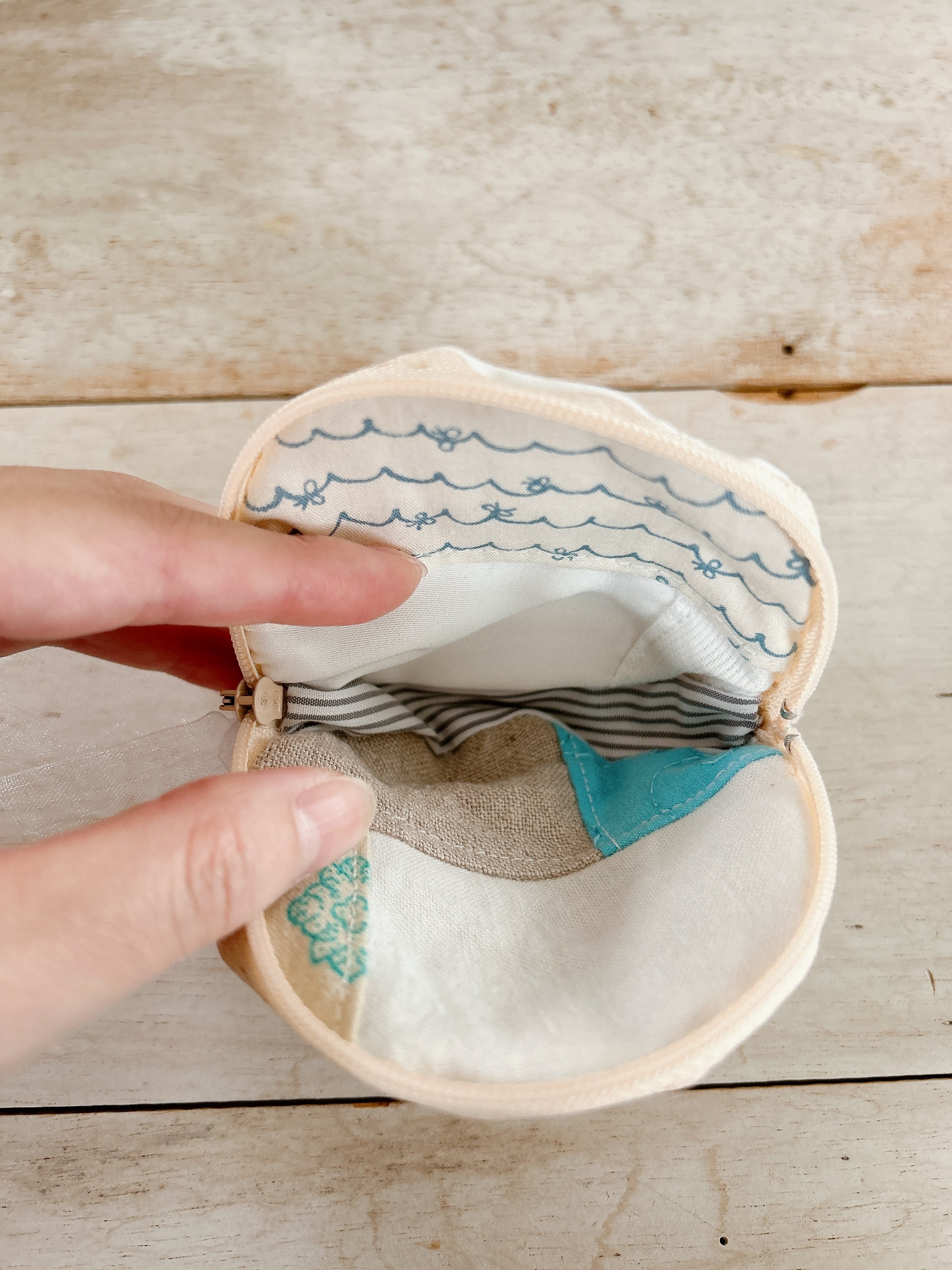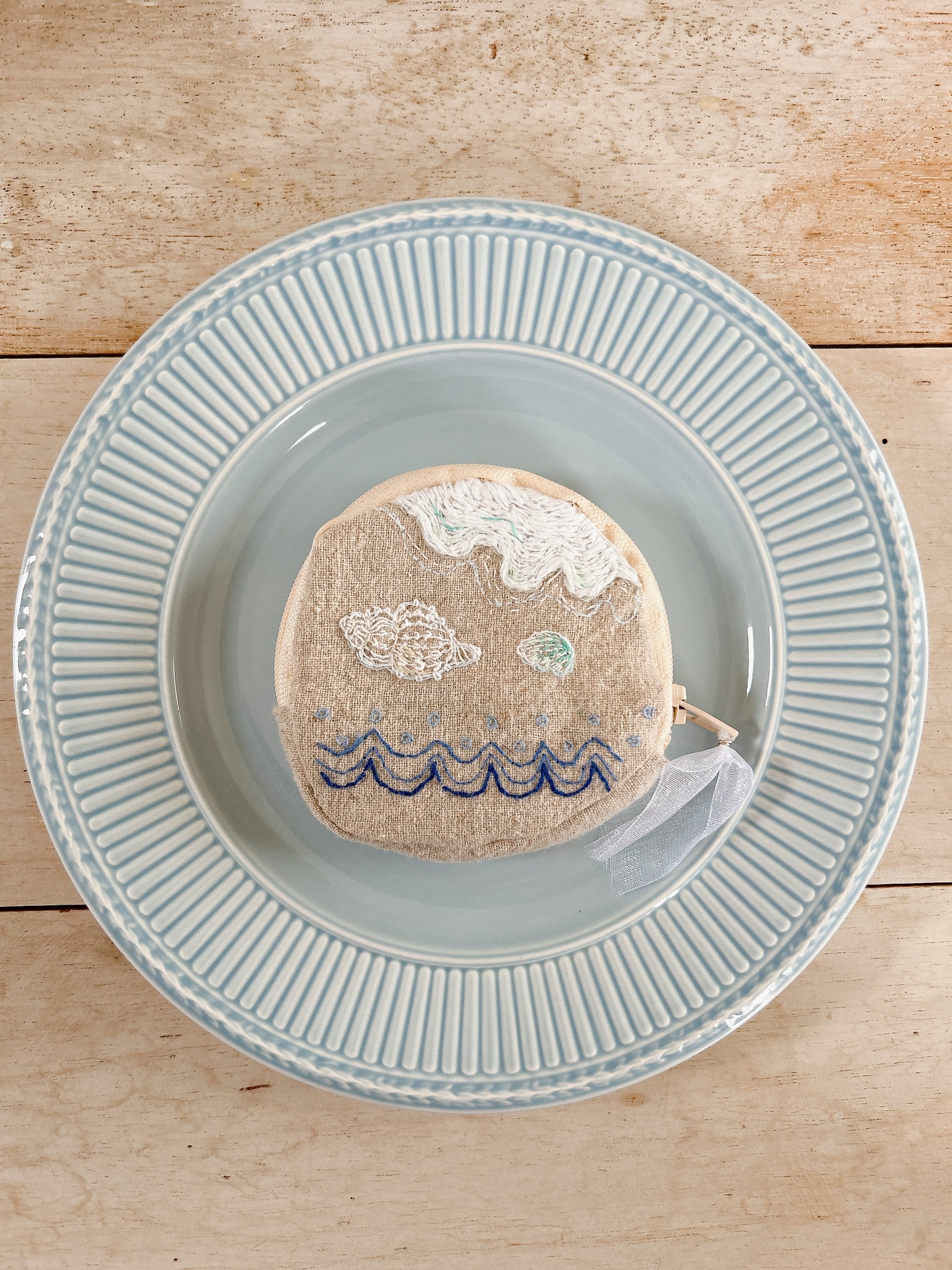 貝殻や波の刺繍が施されている手のひらサイズのポーチ