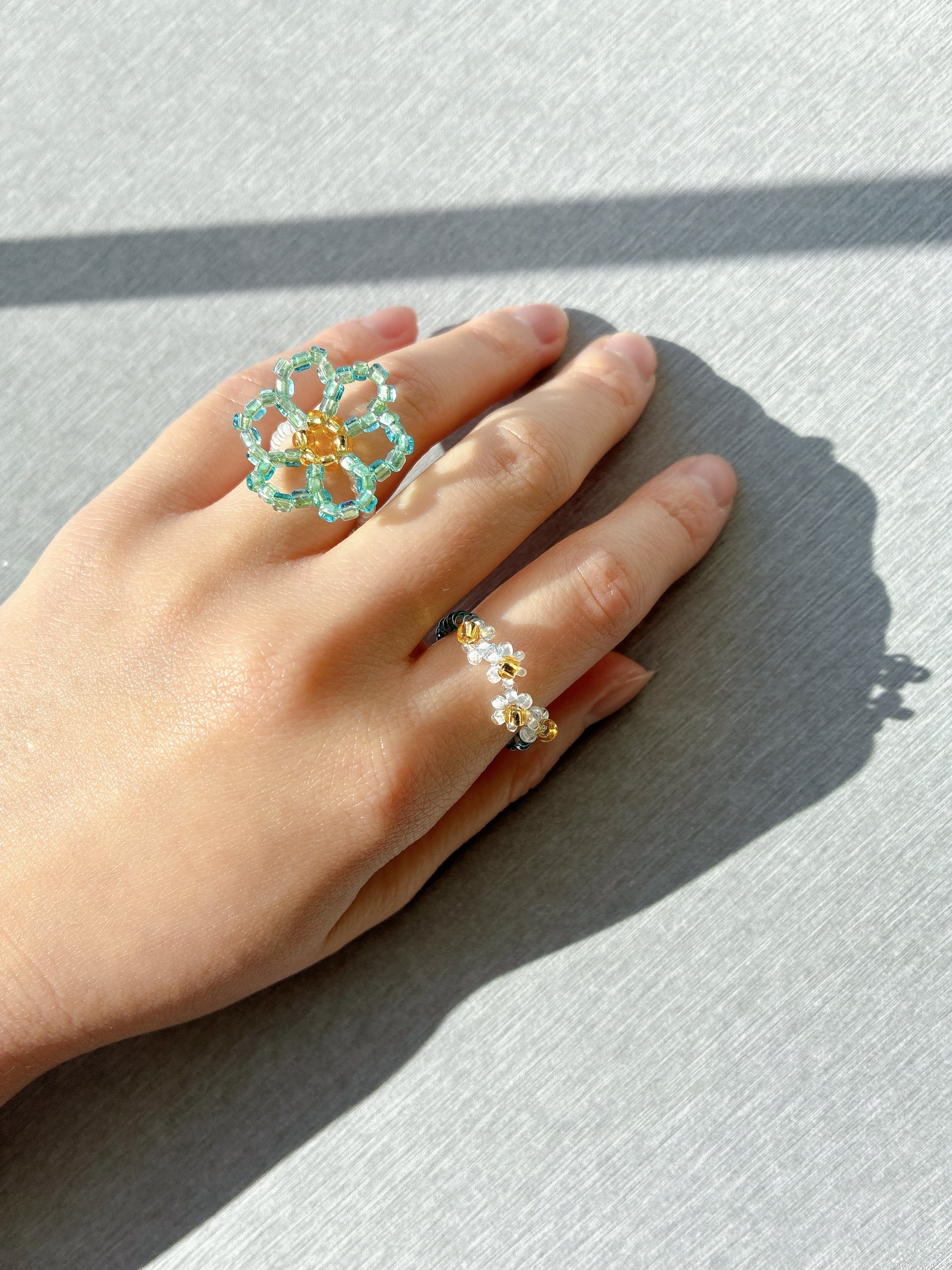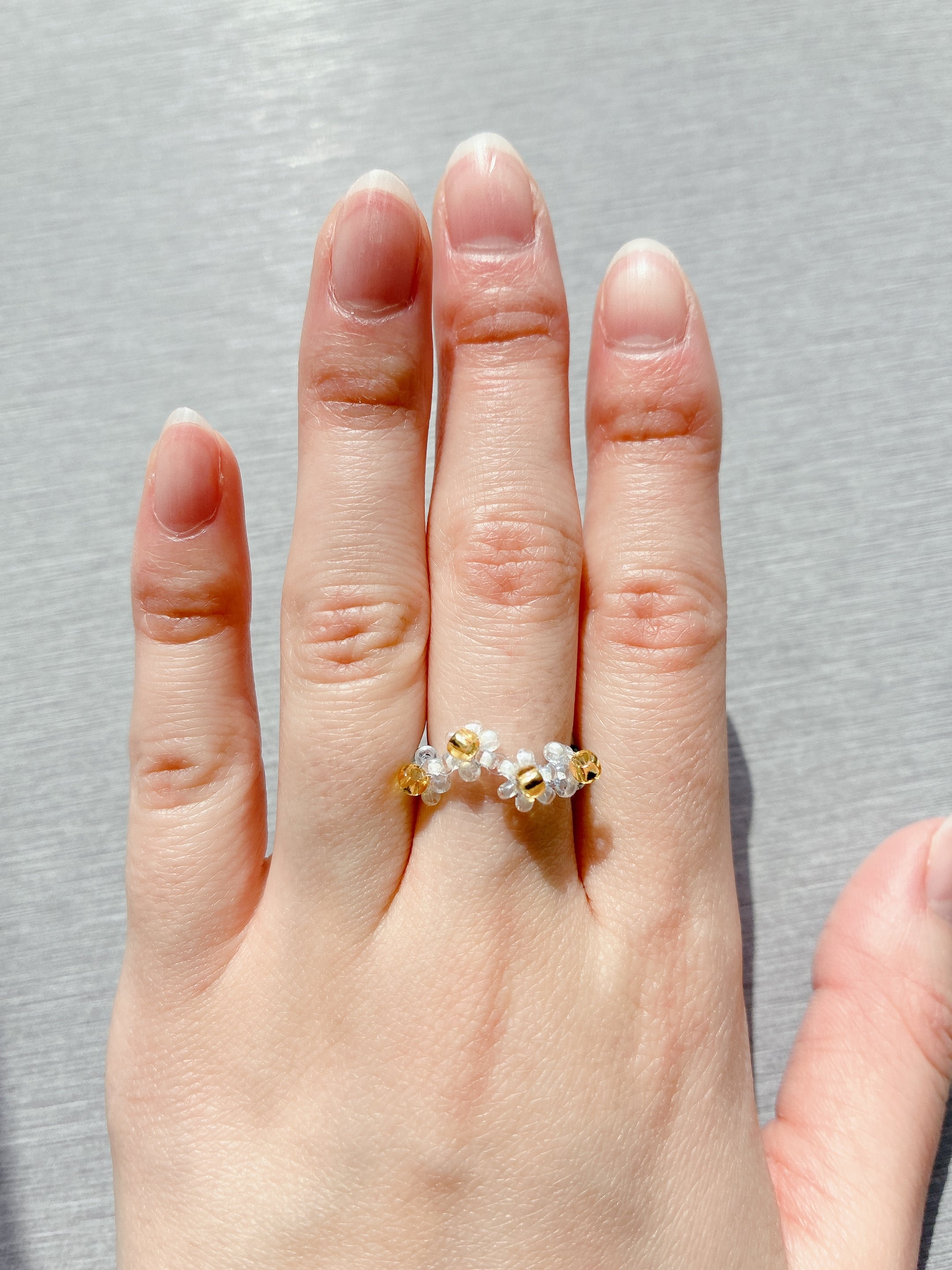 4つの花はジグザグに配置し、輪っかの部分は透明感のある水色のビーズで作っています