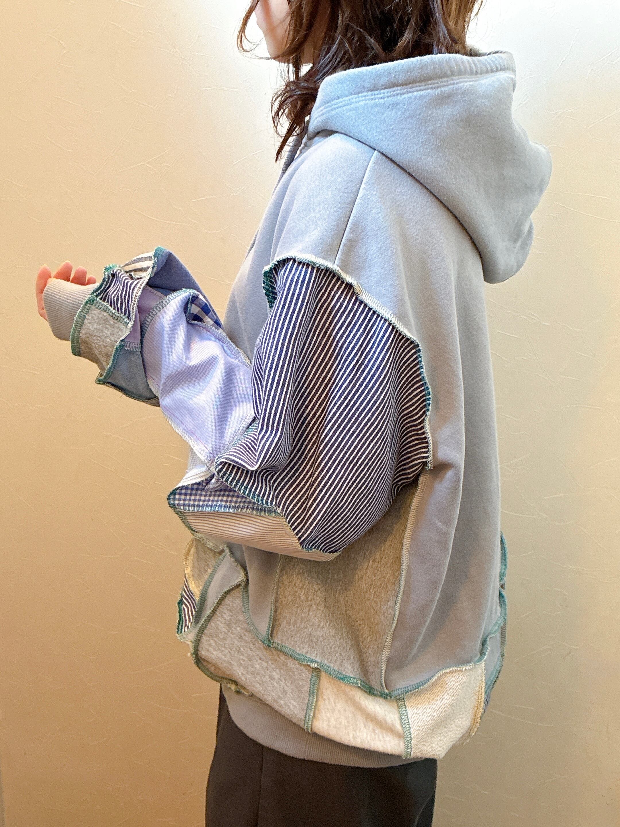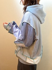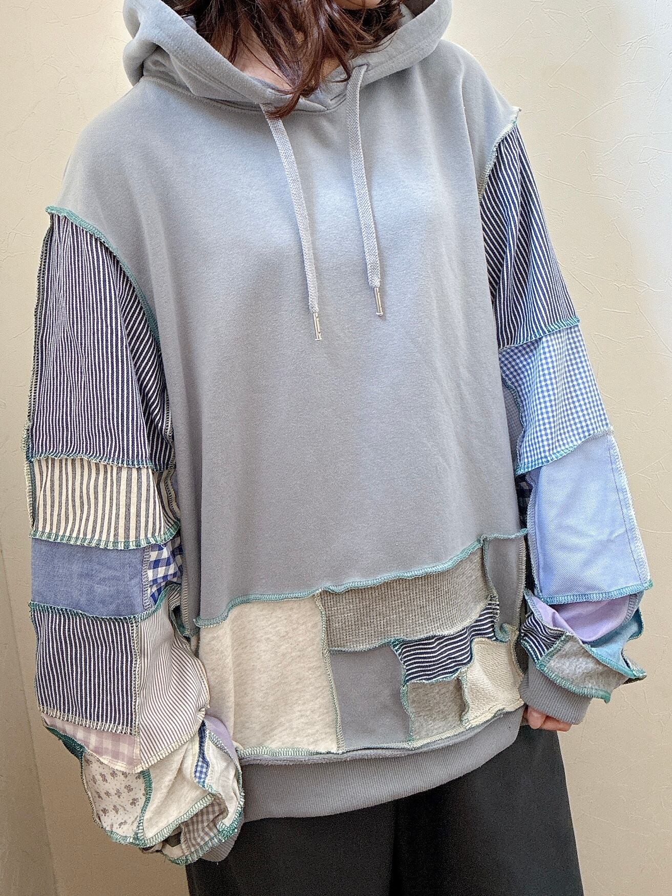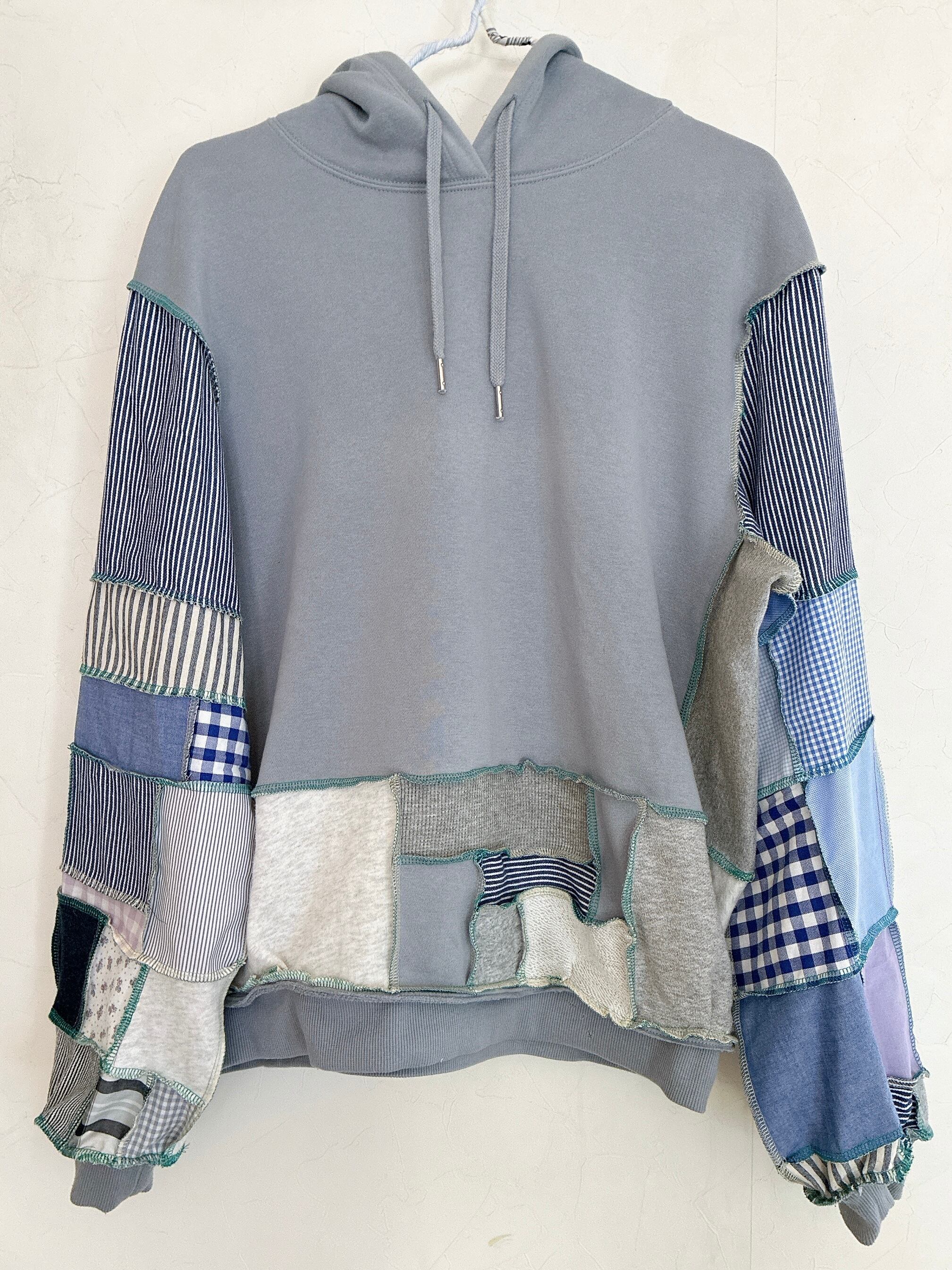 ブルーグレーのパーカー×寒色系の生地で作られた作品